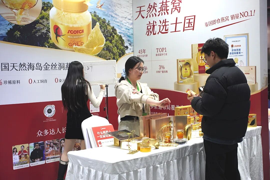 泰国展台上最引人注目的是当地特产的即食燕窝。现场工作人员介绍,展出的燕窝产品选用泰国野生海岛金丝洞燕为原料,洞燕因在野生环境中生长,矿物质含量较为丰富,颇具营养价值。