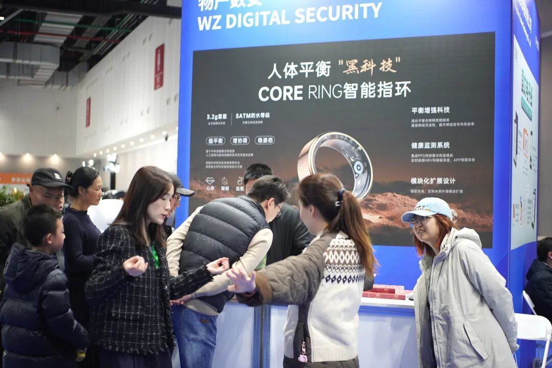 物产数安的智能指环展台前围满了好奇的体验者。工作人员邀请一位观众单腿站立,先不戴指环测试平衡能力。随后对观众身体一侧施加压力,测试其维持平衡的时间。戴上智能指环后,观众保持稳定站立的时间明显延长。工作人员解释道,这款指环通过内置的传感器和特定频率的微振动,刺激手部神经末梢,进而影响人体的感觉系统,从而帮助人体提升平衡感和身体协调性,同时还具备全天候健康监测能力,可以实时监测心率、血氧等身体数据。
