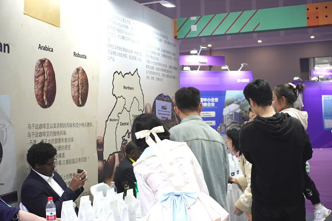 乌干达展台展示了当地特色的咖啡豆,走近就能闻到阿拉比卡和罗布斯塔豆子散发出的甜甜栀子花与淡淡的炭火香气。工作人员介绍,这种风味特征与咖啡豆的日晒处理工艺有关。日晒过程中,咖啡豆保留了部分果香甜味,同时也吸收了阳光晾晒带来的独特气息。