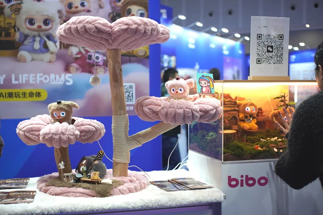杭州镭萌科技展台的主打产品是AI潮玩生命体“bibo”。这个巴掌大小的智能玩偶,有着二头身比例、毛绒覆盖的身体和搪胶材质的面孔。bibo的一双眼睛,由高清显示屏制成,能够呈现丰富的眼神变化。而脖子上配备了双舵机,让它可以自然地转动头部。